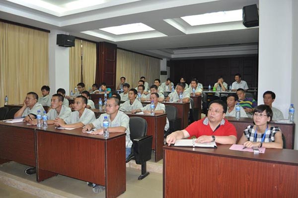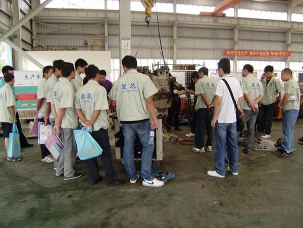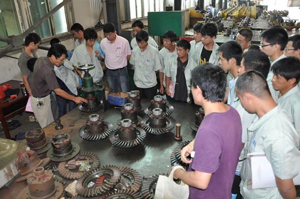 本次研討學(xué)習(xí)班共有來(lái)自全國(guó)各地區(qū)共計(jì)40名的一線服務(wù)人員參加。此次學(xué)習(xí)班,引起我司領(lǐng)導(dǎo)高度重視,不僅組織了相關(guān)部門(mén)領(lǐng)導(dǎo)系統(tǒng)授課:從新品介紹到各個(gè)機(jī)型的特點(diǎn),從發(fā)動(dòng)機(jī)故障判斷維修到管路液壓件原理介紹,從制動(dòng)系統(tǒng)學(xué)習(xí)到油缸的拆裝;而且與相關(guān)配套廠商協(xié)商,組織全體學(xué)員到相應(yīng)的工廠系統(tǒng)學(xué)習(xí)驅(qū)動(dòng)橋、變速箱、變矩器等主要零配件安裝維護(hù)課程!