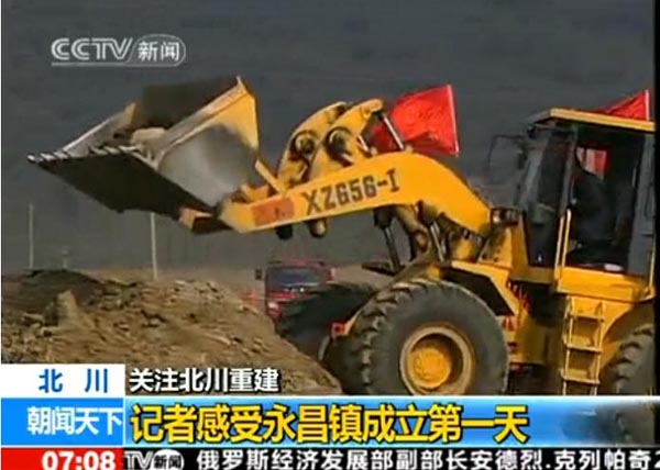 2010年2月3日早7:08分,央視新聞?lì)l道的朝聞天下欄目,播出了汶川地震后第一個(gè)異地重建的新縣城---北川縣城所在地永昌鎮(zhèn)黨委、政府正式掛牌成立的報(bào)道,目前,北川的各項(xiàng)工程建設(shè)正在如火如荼的進(jìn)行中,其中在央視的報(bào)道中,廈裝XZ656-Ⅰ裝載機(jī)正在繁忙的作業(yè)中。據(jù)了解,我司的裝載機(jī)在汶川地震后的重建中發(fā)揮了重要作用。